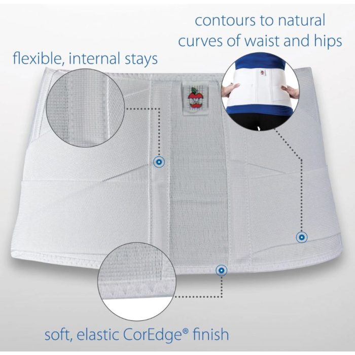The anatomical form contours to the natural shape of the lumbosacral spine for comfort. The dual elastic side pulls provide firm compression and crisscross design offers additional stability. The soft elastic CorEdge finish around top and bottom edges offers added comfort and flexibility.