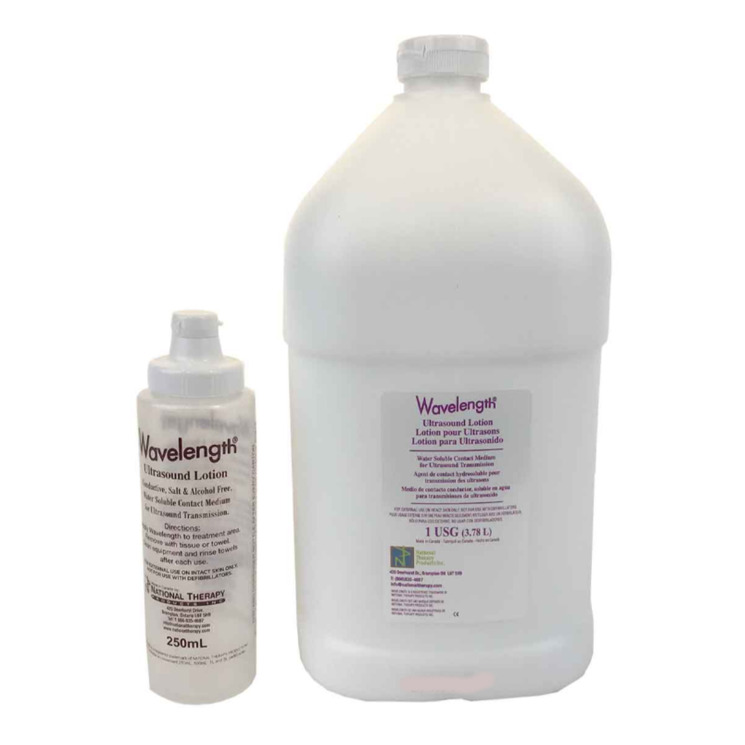 Wavelength Ultrasound Lotion is recommended for use where a medium viscosity lotion is preferred. The lotion is enriched with Aloe Vera; contains no salt, alcohol or dye; advanced water soluble, hypoallergenic, bacteriostatic formulation; conductive, non-corrosive, greaseless & non-staining. 1 gallon bottle. One 8 oz. bottle included.